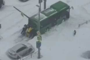 Появилось видео, как жители Южно-Сахалинска вызволяли автобус в метель