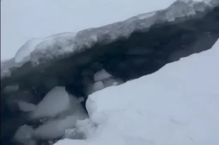 Мужчина на частном судне на воздушной подушке организовал переправу рыбаков через трещину.