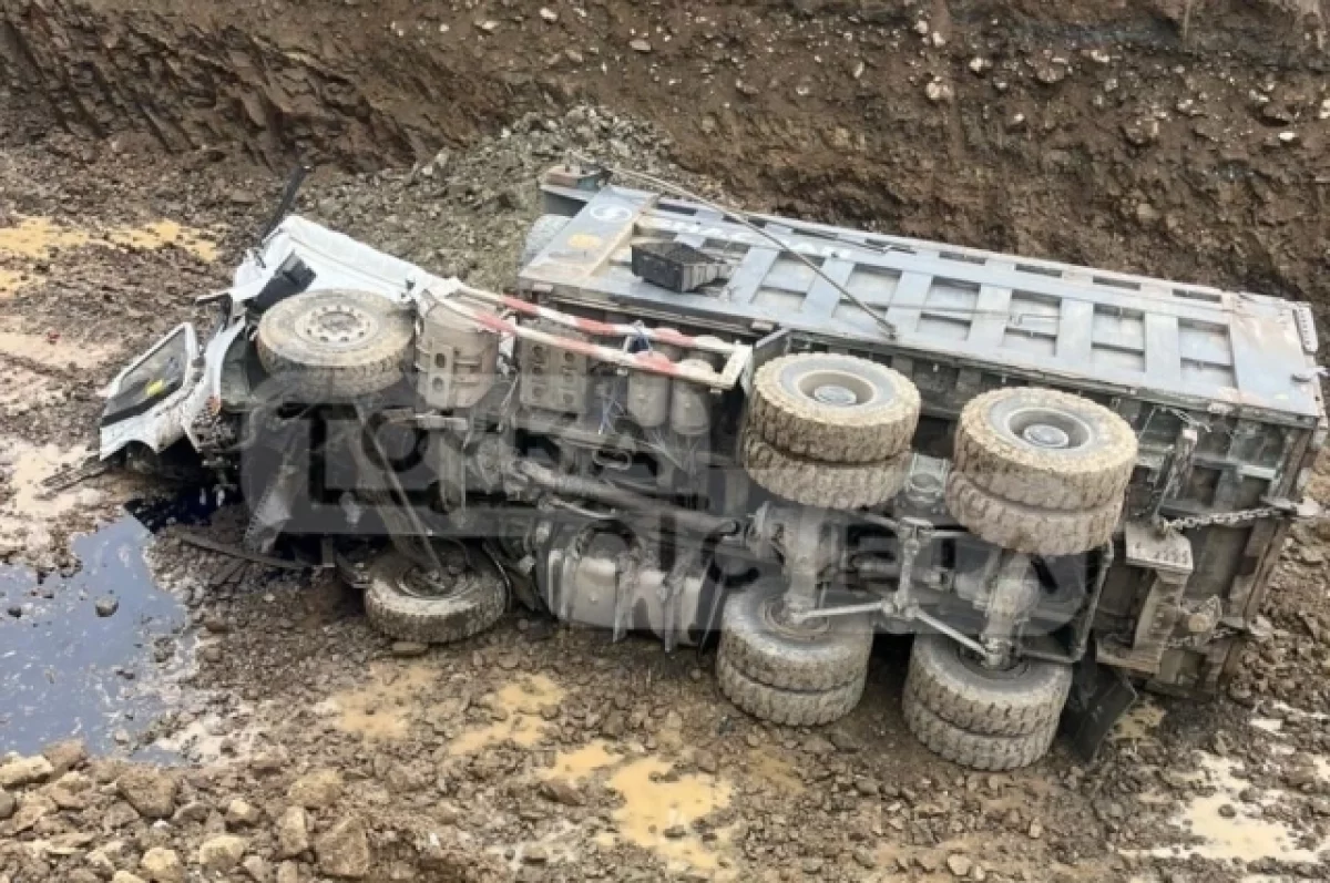 Большегруз упал в котлован на охотской трассе на Сахалине