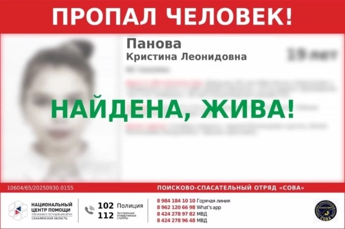 Волонтеры ПСО «Сова» сообщили, что 19-летняя Кристина Панова нашлась, она жива. Где она пропадала, не сообщается.