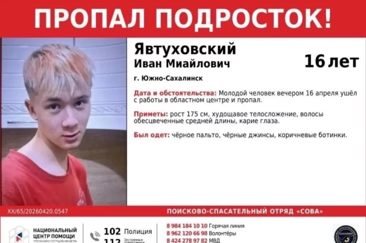 Подросток 16 лет ушёл с работы в Южно-Сахалинске вечером 16 апреля 2026 года и пропал, сообщили в Сахалинском поисково-спасательном отряде «СОВА» и пресс-службе СУ СКР по Сахалинской области.