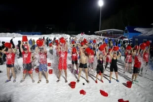 Участники надели футболки в цветах российского флага, вместе выполнили массовую зарядку, а затем одновременно окатились из вёдер.