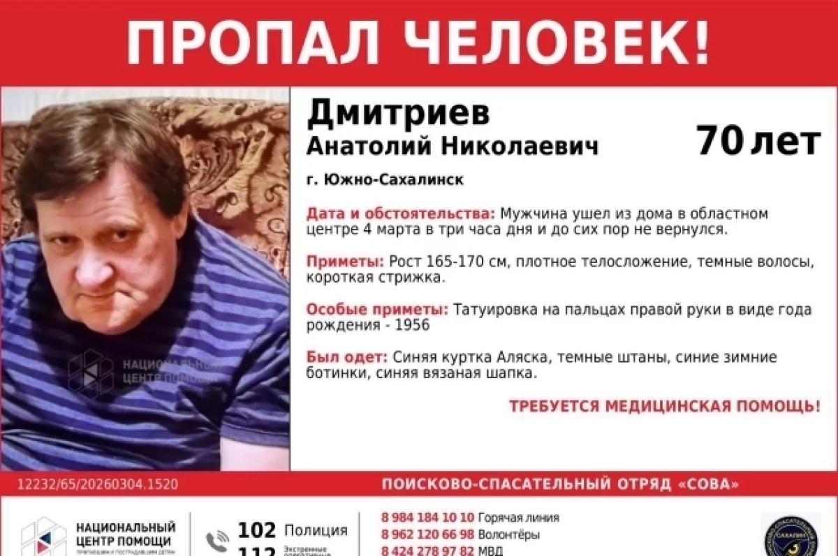 Пенсионер с проблемами с памятью разыскивается в Южно-Сахалинске. 70-летний Анатолий Николаевич Дмитриев ушел из дома в областном центре 4 марта в 15.00 часов и до сих пор не вернулся.