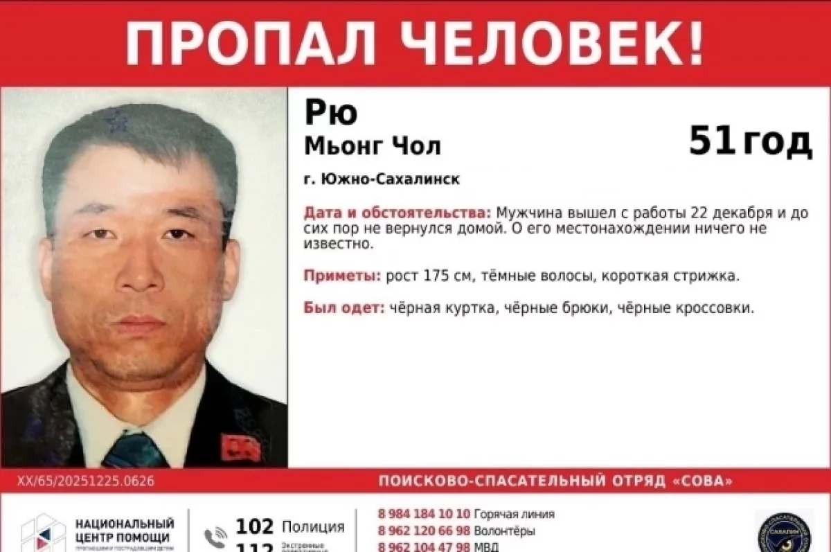 Родственники и полиция Южно-Сахалинска разыскивают 51-летнего Рю Мьонг Чол.