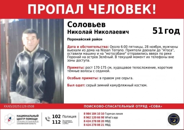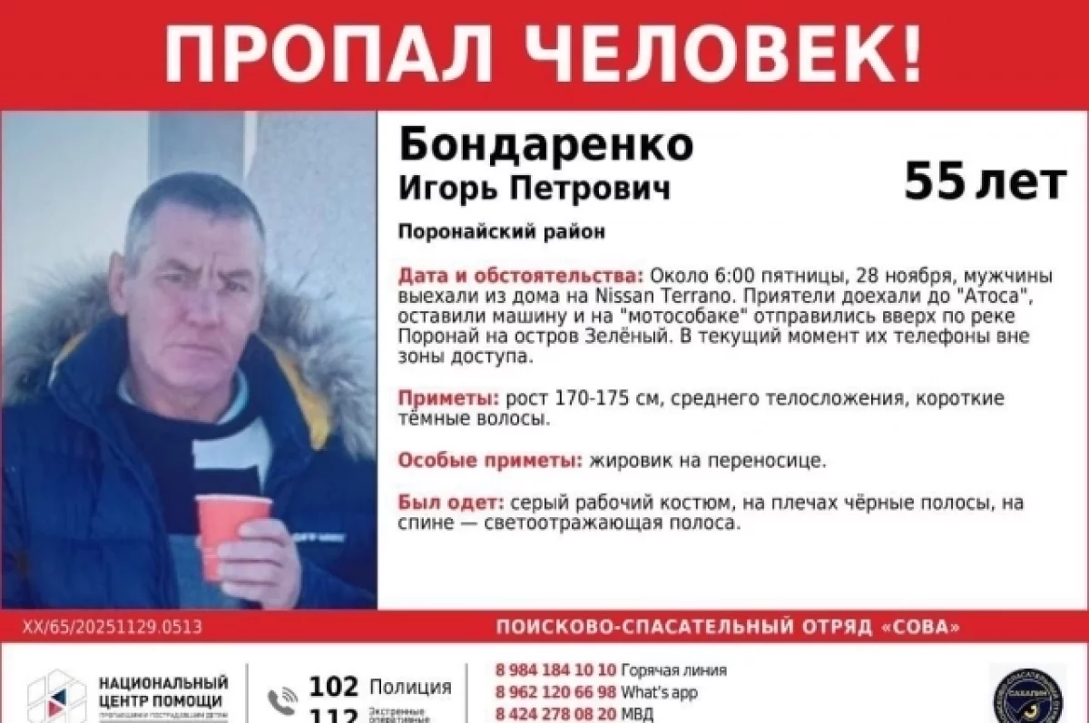 Около 6:00 28 ноября мужчины выехали из дома на автомобиле Nissan Terrano. Товарищи доехали до "Атоса", оставили машину и на "мотособаке" отправились вверх по реке Поронай на остров Зелёный. В данный момент их телефоны отключены, на связь они не выходят.