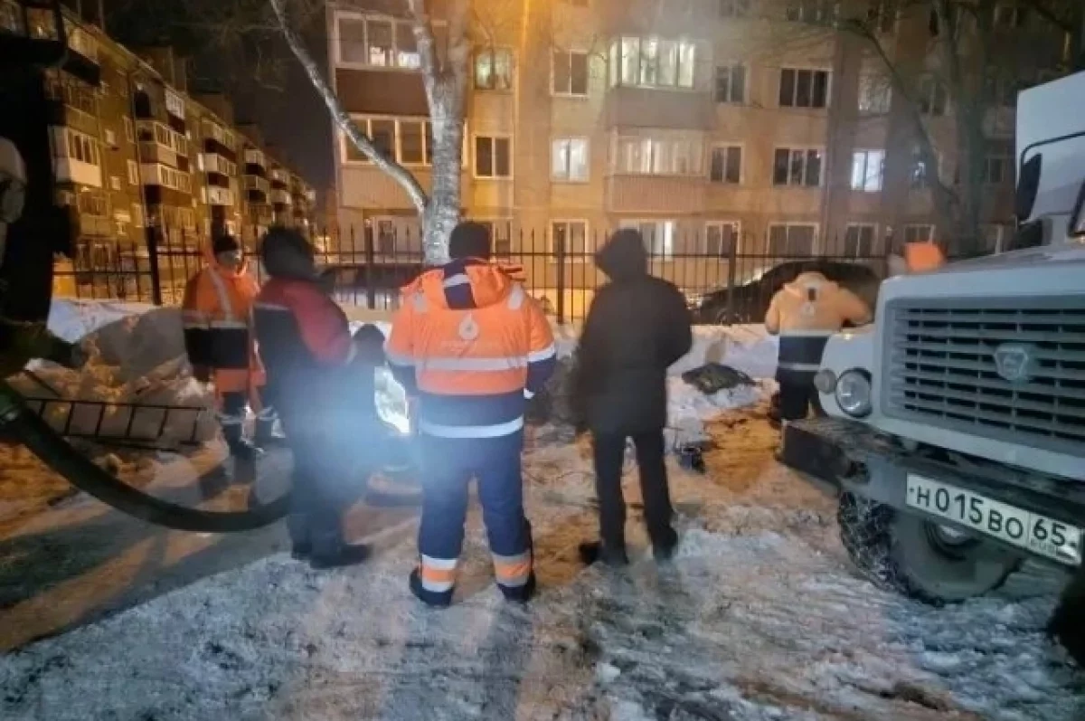 Сложное повреждение на улице Поповича в районе дома № 106а устранили в Южно-Сахалинске, работы заняли всю ночь на 20 февраля, сообщили в «РВК-Сахалин».