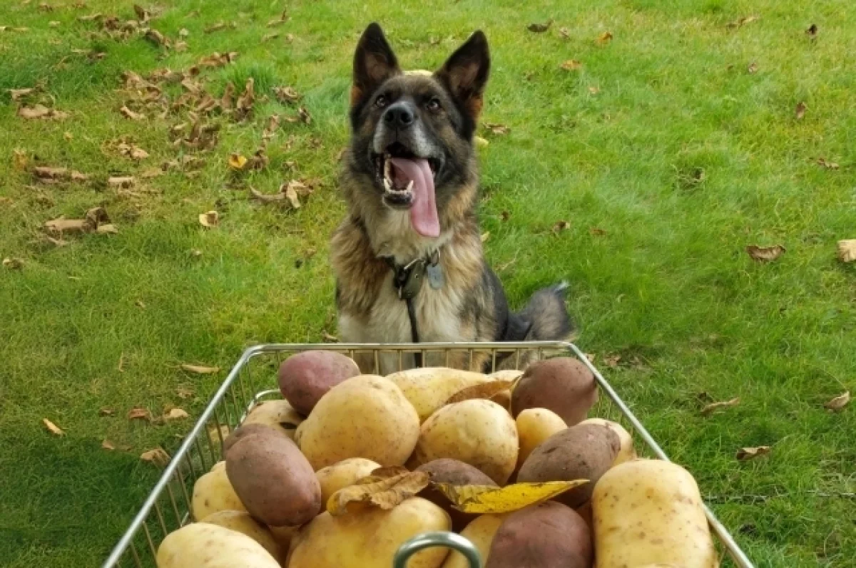 На кадрах собака по кличке Пёселька, звезда соцсетей предприятия, контролирует отгрузку картофеля.