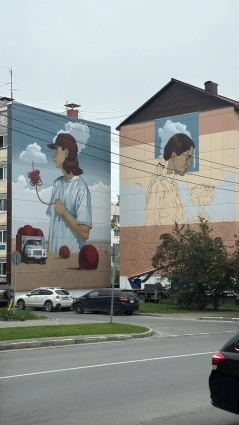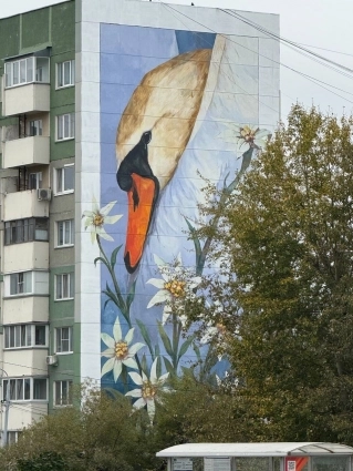 Новые муралы украсили фасады домов в областной столице. Художники изобразили лебедя, цаплю, горбушу, Чехова и девушку с деревом.